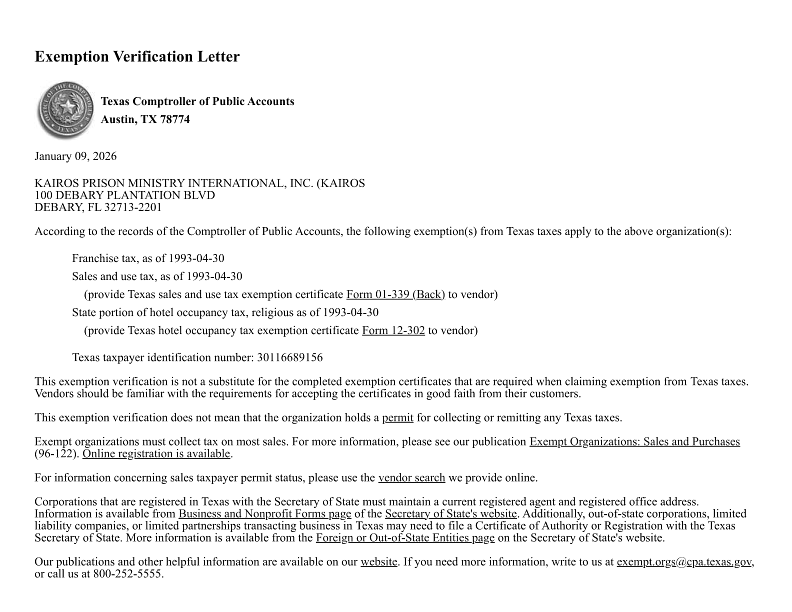 Ready to impact lives at the Crain Unit? At Kairos of Texas, we believe everyone deserves a second chance. Whether you're interested in volunteering, donating, or learning more about our ministry, reach out! Your involvement can foster hope and transformation. Together, let’s create lasting change!