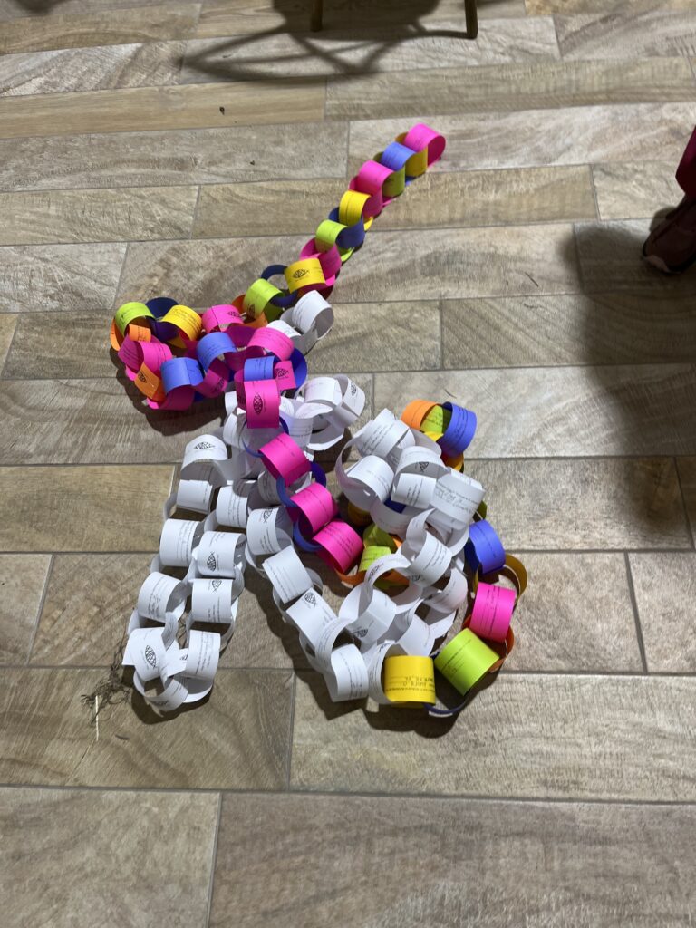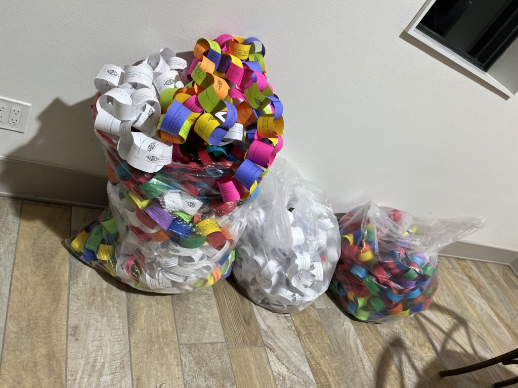 Slips are filled out with first name & city of people who commit to pray for Kairos Th, Fri, Sat, Sun or all days. Each day is a different color. These links are placed together to form a chain which wraps along the walls of a gym where the event takes place. Each bright color of the chain represents a day(s) a person has chosen to commit to pray. Prisoners (“men in white”) who have experienced Kairos &/or are Christian MIW sign white strips. “Free world people” who are us sign colored strips. All are amazed at this sight & view people from all over the world who are praying. Some make social media requests & are able to reach an even broader audience of prayer warriors. Pray that each cookie brings those who eats it closer to God. Pray that the placemats, food served, prayer chains, letters, & all agape fill each man’s heart with God’s unconditional love. Ask God to use it as a source of His love to shine on those involved during the Kairos weekend.